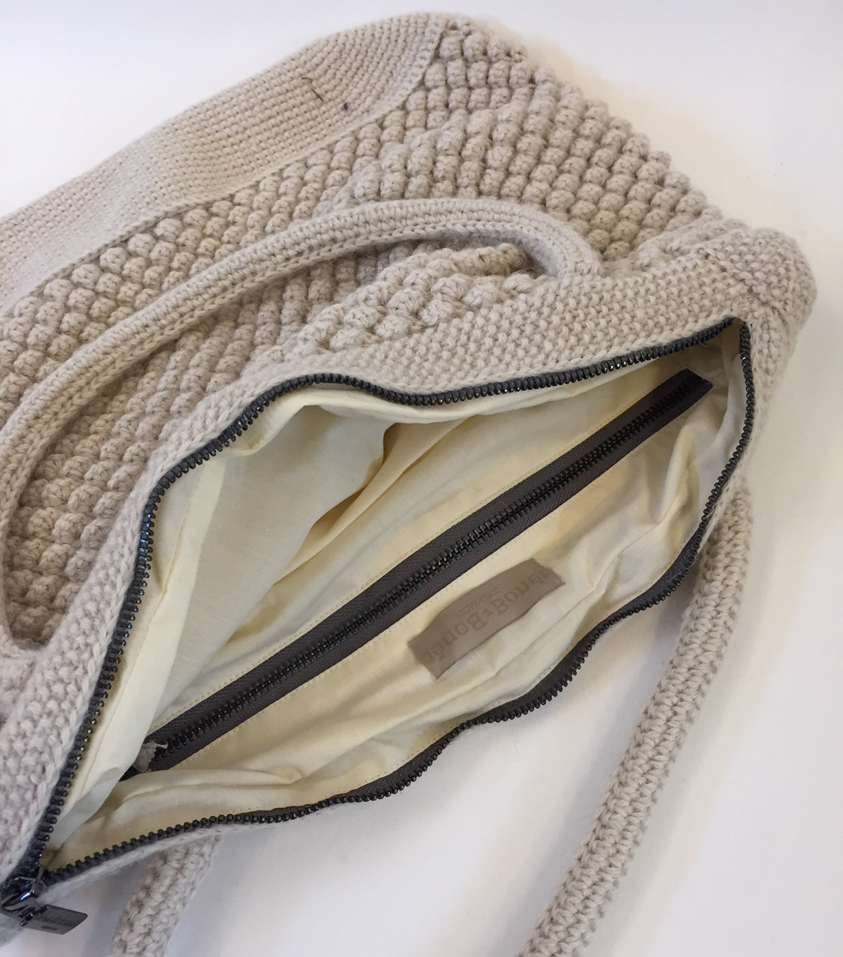 Luksus tasken til mor, som har brug for både bleer, tæppe, legetøj og ekstra tøj, med på farten, Den smukke taske kan rumme lidt af hvert og er samtidig utrolig smuk. Tasken har et stort indvendigt rum og et lille med lynlås. Tasken har bomuldsfoer og er udvendigt strikket i en smuk struktur – i blød og lækker baby lama. Taskerne passer i farve til de smukke tæpper fra bonét et bonét. Tasken er også meget velegnet som shopper og ud over det også perfekt på en tur til vandet. En klassisk taske, som hurtigt bliver favoritten. Tasken har to hanke, som måler ca 42 cm hver. Tasken er ca. 42 cm bred og 29 cm høj, bunden er ca. 12,5 cm.