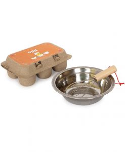 Det skønneste lille æggesæt, med 6 æg i en æggebakke, hvoraf 3 af æggene kan deles med hviden og blommen for sig, super sjovt. Der medfølger lille piskesæt med lille metalskål og piskeris med træhåndtag.Skålen er ca. 12 cm