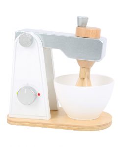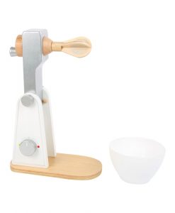 Den fineste røremaskine i træ, til den lille kok. Super flot og kan åbnes op. Maskinen er ca. 18 x 10 x20cm. Piskeriset kan drejes rundt, så man helt fornemmer,hvordan man laver en dej. Skålen er i plastic og maskinen er i træ.