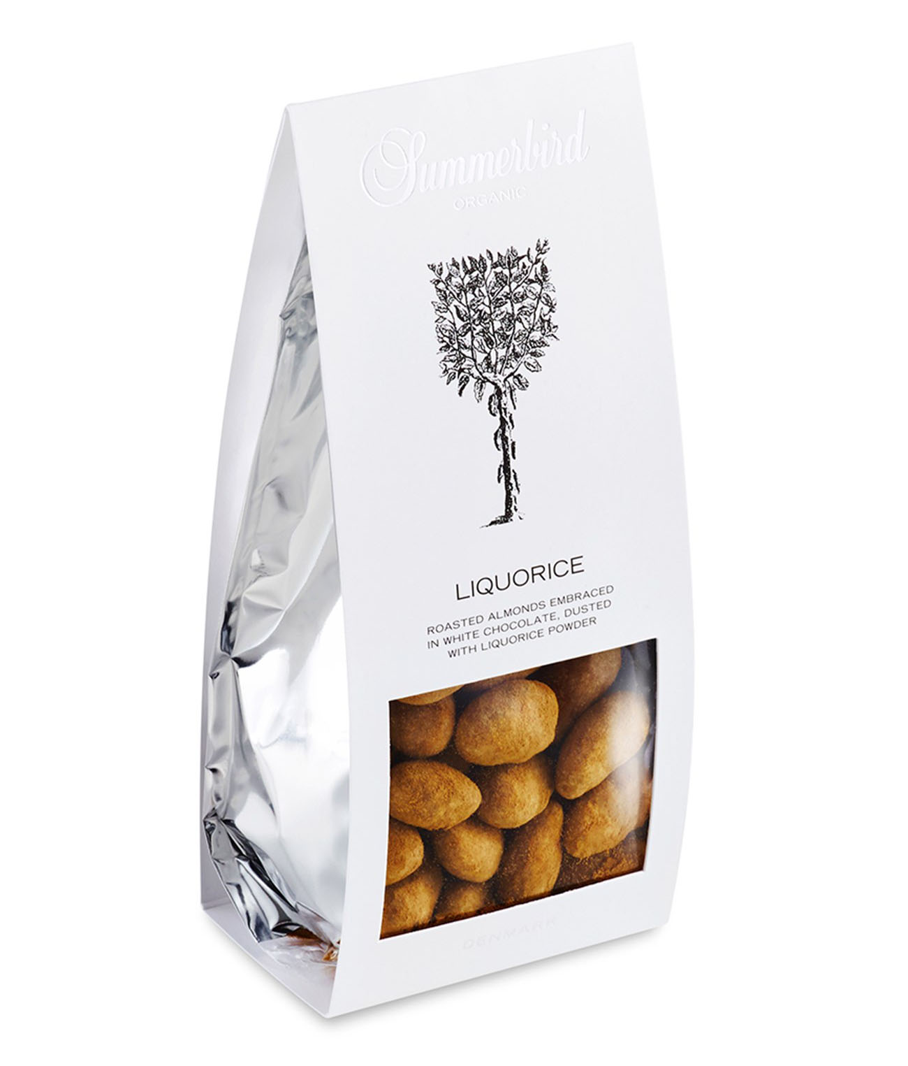 100 grem økologiske let ristede spanske mandler, drageret med et tyndt lag hvid chokolade og afslutningsvis vendt i lakridspulver. Kombinationen af den sprøde mandel, hvide chokolade og den karakteristiske lakrids har skabt en kontrastfyldt og vanedannende mandel til alle, som holder af lakrids.