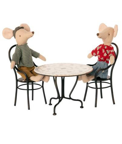 Det fineste Maileg spisebordssæt. Skønt rundt bord med 2 stole. Lavet i metal og passer perfekt ind i dukkehuset. Kan bruges til både mus og kaniner.