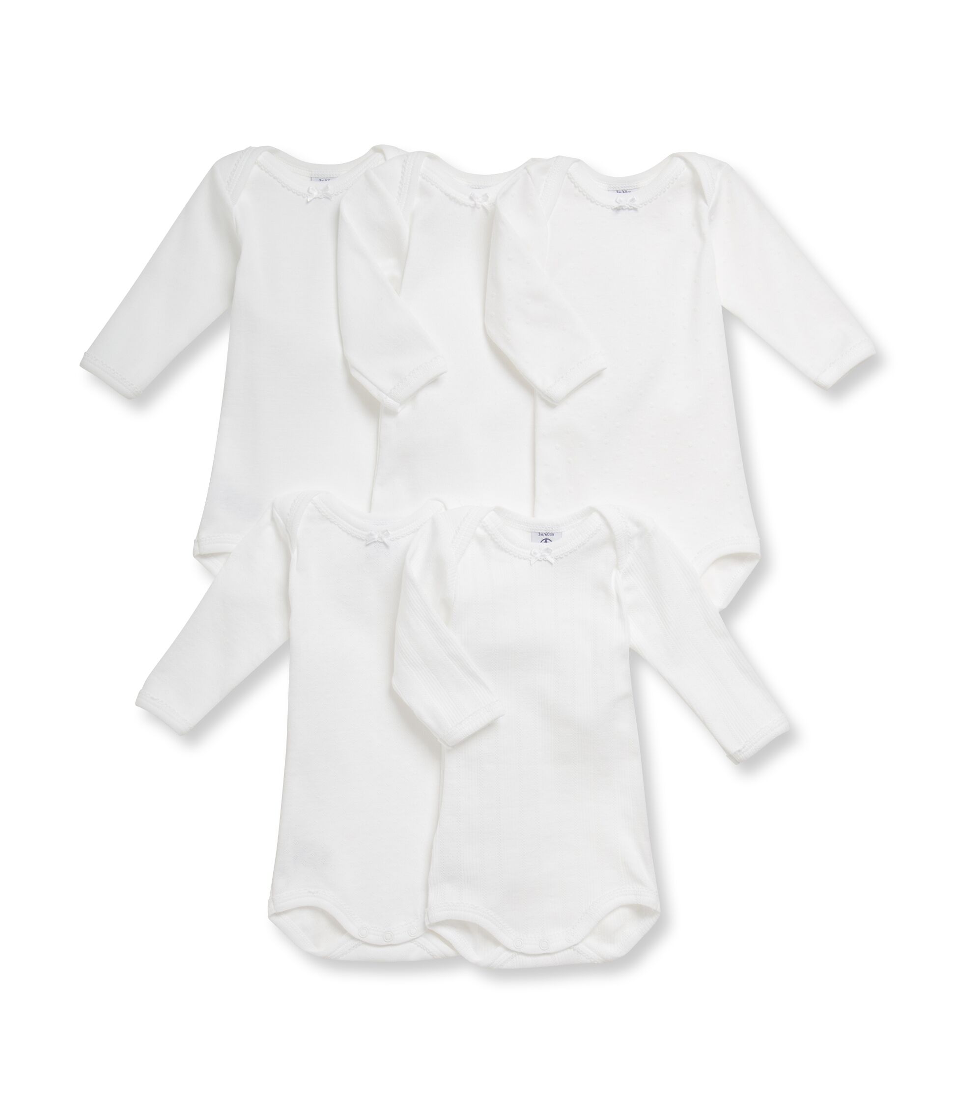 Den ultimative 5-pak body fra Petit Bateau – bodyerne har forskellige smukke hulmønstre eller prikker i en hvid. Den ene er plain. Det kan være lidt svært, at se på billederne – men den ene f.eks. med et alt for fint prik hulmønstre. Virkelig idyllisk og elegant. Alle er super lækre basis body, som kan bruges i en hver anledning. Bodyerne er i høj økotex kvalitet og holder både form og farve ved gentagende vask. Petit Bateau er til den lille side og er her i cm mål. Kommer ikke i æske!