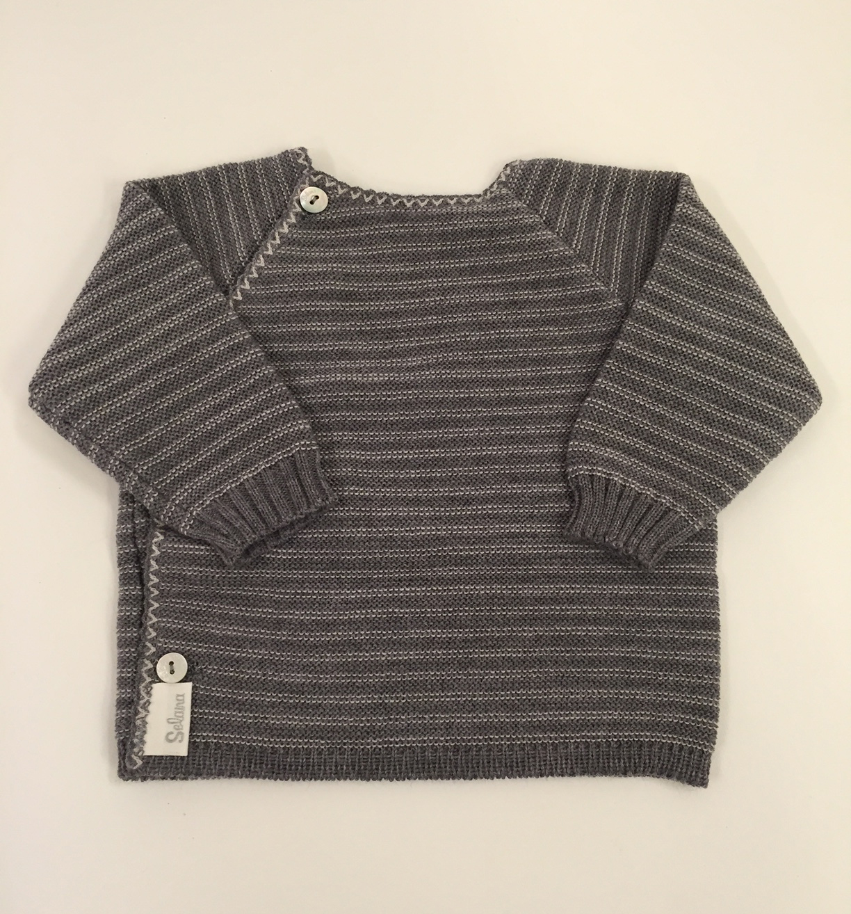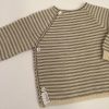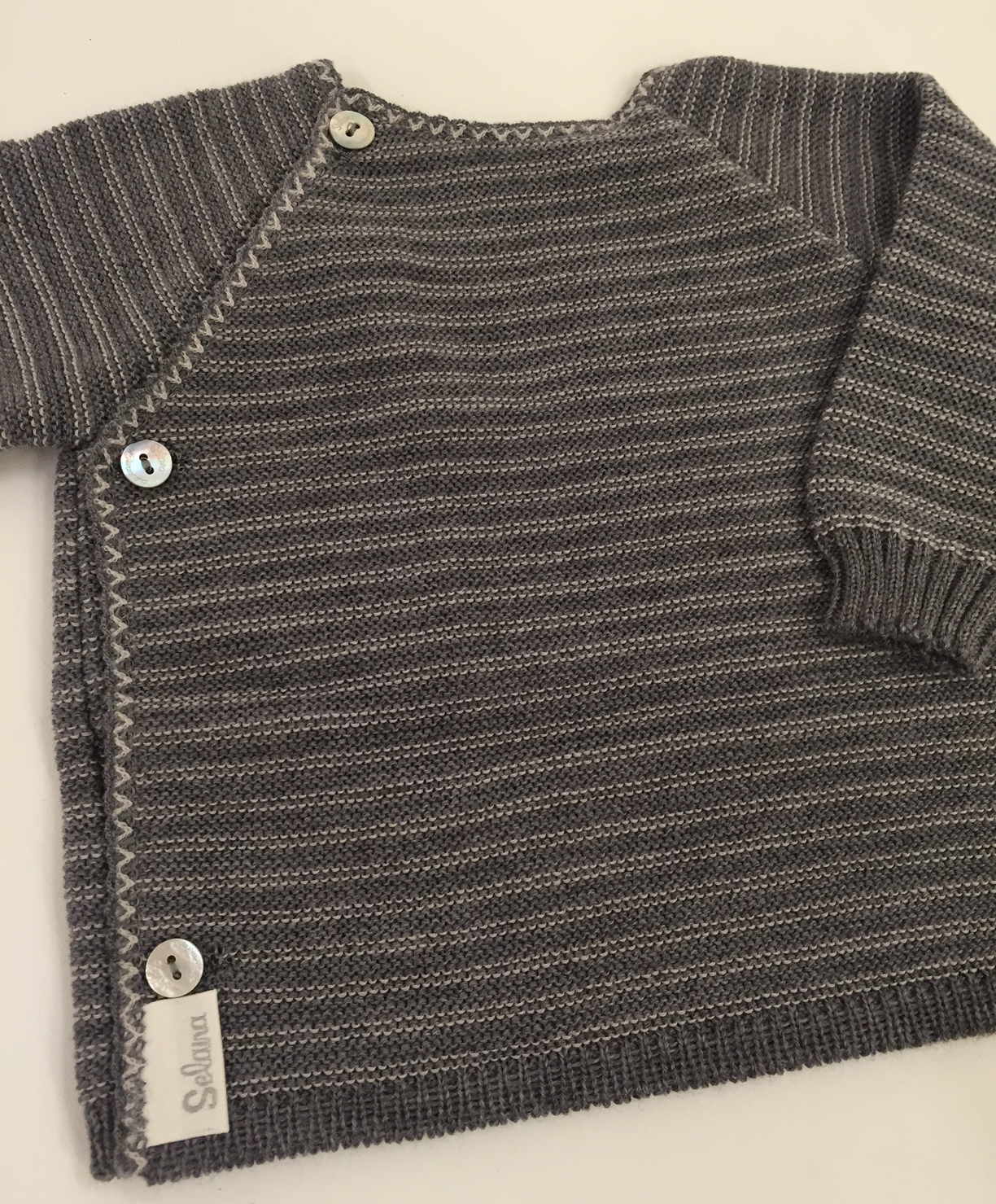 Den smukkeste lille slå-om cardigan – med smukke klassiske striber i skønne naturfarver. Blød og fin merinould indfarvet med plantefarve. Skøn farve kombination, som passer til både små drenge og piger. En helt fantastisk cardigan, som kan bruges både til hverdag og fest. Selana er i højeste kvalitet og udførelse. En trøje, som holder generation efter generation. Vi anbefaler håndvask.