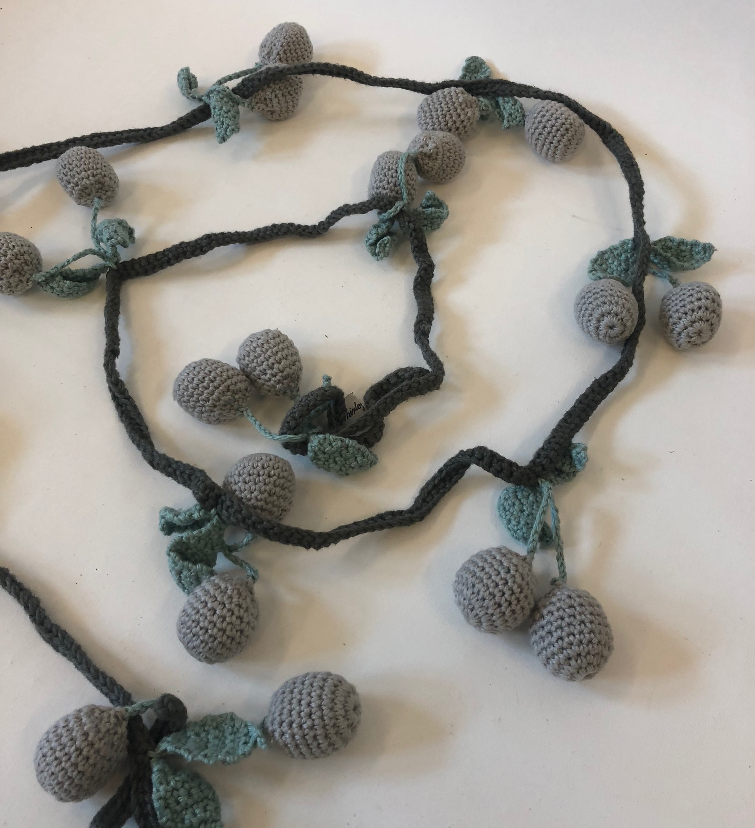 Den fineste ranke – med flotte kirsebær. Ranken er i 100% økobomuld og er et hyggeligt indslag, på et hvert børneværelse. Ranken kan bruges både for enden af sengen, over puslebordet, i legeteltet, i barnevognen – mulighederne er mange. Den fineste barselsgave. Denne ranke er 2 meter lang.