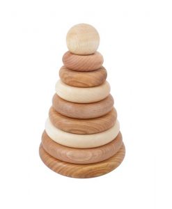 Det allerfineste stabeltårn i helt økologisk træ i flere træsorter. Kan stables igen og igen med de smukke runde ringe, som er behandlet med bivoks uden nogle former for skadelig kemi. Udvikler og stimulerer motorikken og den logiske sans – fantastisk og originalt stykke legetøj i en luksus version, som kan holde til leg generation efter generation. Legetøjet er en fryd for øjet og kommer smukt emballeret. Den perfekte gave både til helt lille og lidt større børn.
